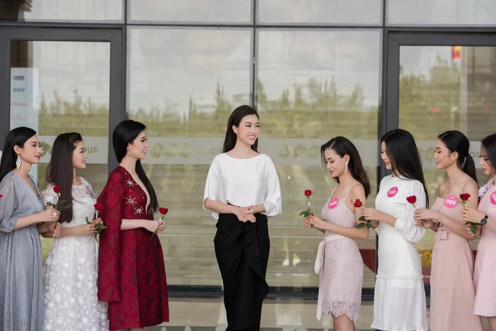Các thí sinh lắng nghe hoa hậu Đỗ Mỹ Linh giới thiệu về các dự án nhân ái