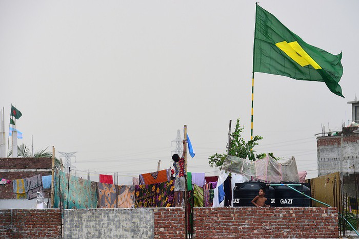 Ảnh chụp ngày 6-6-2018 cho thấy một cậu bé treo cờ Argentina ở ngoại ô thủ đô Dhaka để chuẩn bi cho World Cup 2018 - Ảnh: AFP